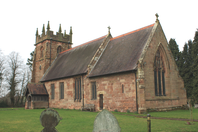 The exterior is mainly in Tudor-Gothic style. Earlier Gothic is visible inside the church. The 3-bay nave arcade has octagonal piers and stepped round arches characteristic of this part of Staffordshire in the 13th and 14th century, although the pier at the east end is 19th century and supports a narrow pointed arch added to accommodate the organ.