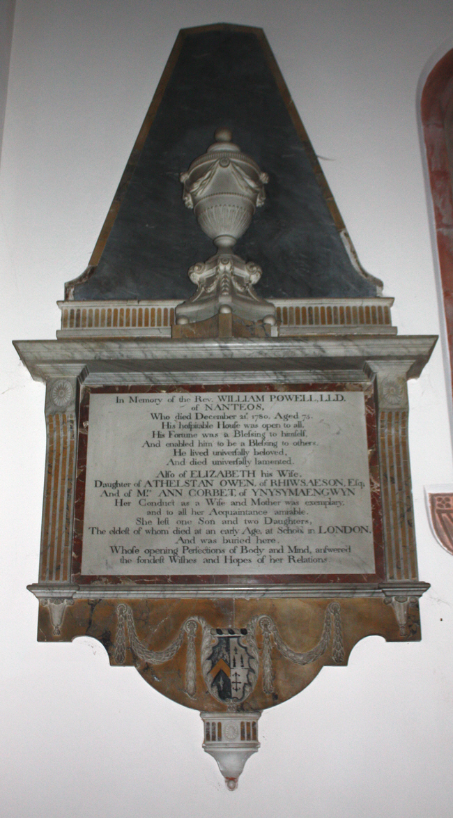 The large and fine white and grey marble monument to Lewis Pryse of Gogerddan and Woodstock, (died 1779), with rusticated base and a pedimented plaque framed by half-balusters.