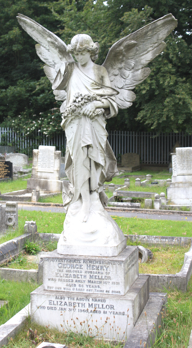 An elaborate and attractive statue of an angel standing guard over the deceased.