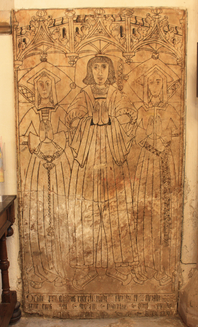 An alabaster slab showing Robert Mundy (died 1526) and his two wives.