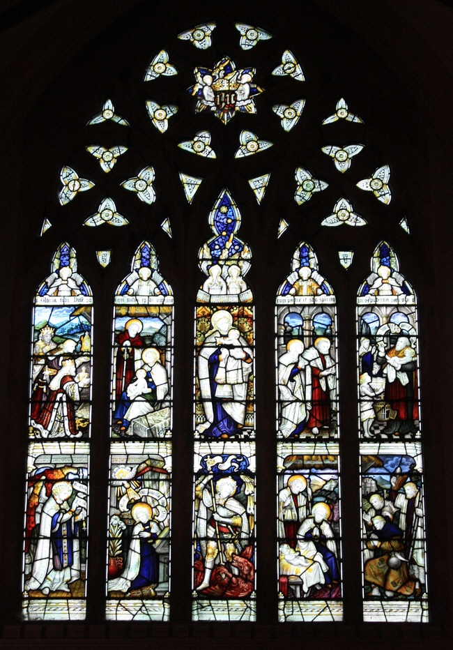 The stained glass in the east window is particularly impressive. The small wheatsheaf at the foot of ermine robe in the top left section is the hall-mark of Kemp.