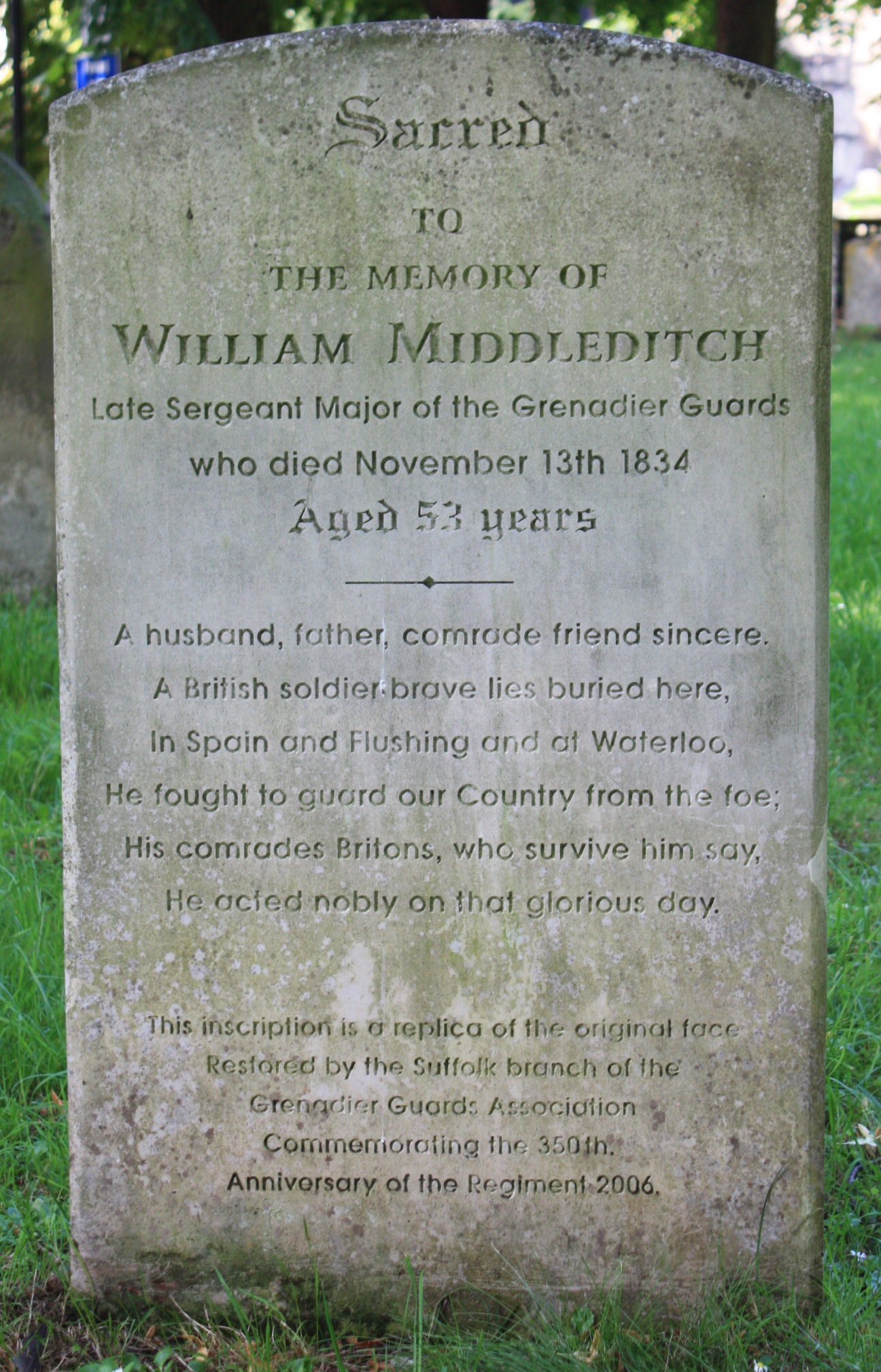 William Middleditch was a Sergeant Major in the Grenadier Guards. He served in Spain, Flushing and at Waterloo.