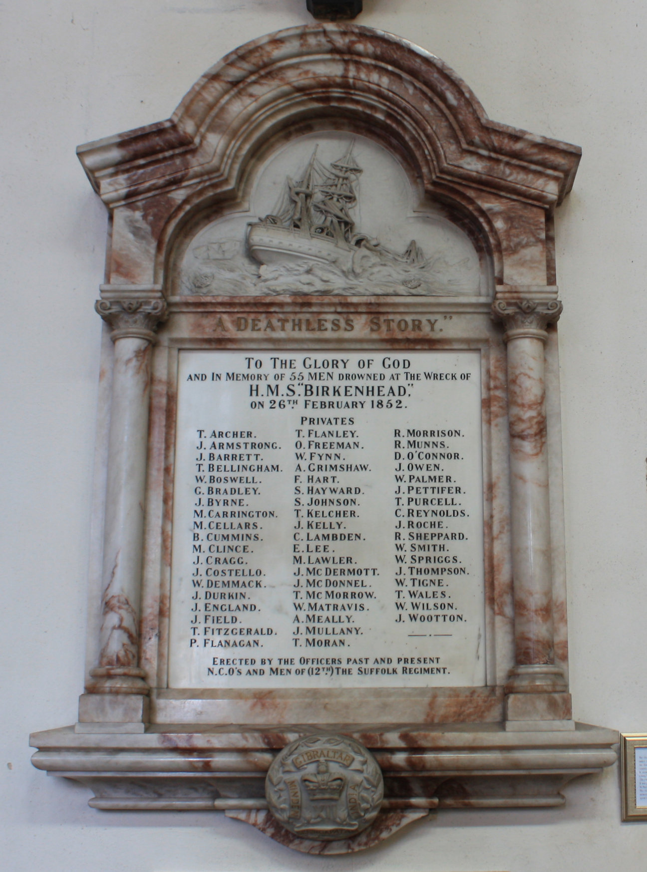 The memorial to the shipwreck of the Birkenhead - the origin of the "Birkenhead Drill". Only 193 of the estimated 643 people on board survived, and the soldiers' chivalry gave rise to the unofficial "women and children first" protocol when abandoning ship, while the "Birkenhead drill" of Rudyard Kipling's poem came to describe courage in face of hopeless circumstances.