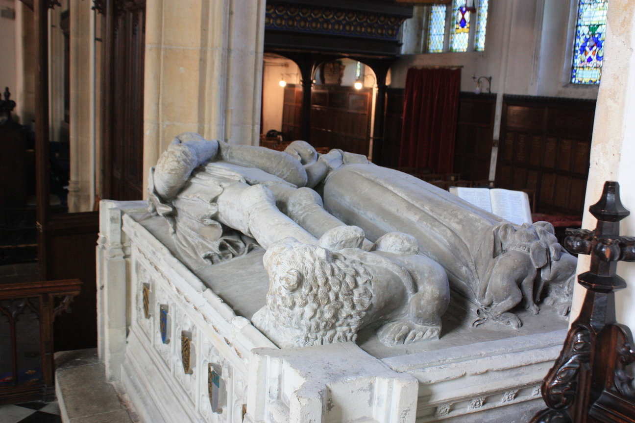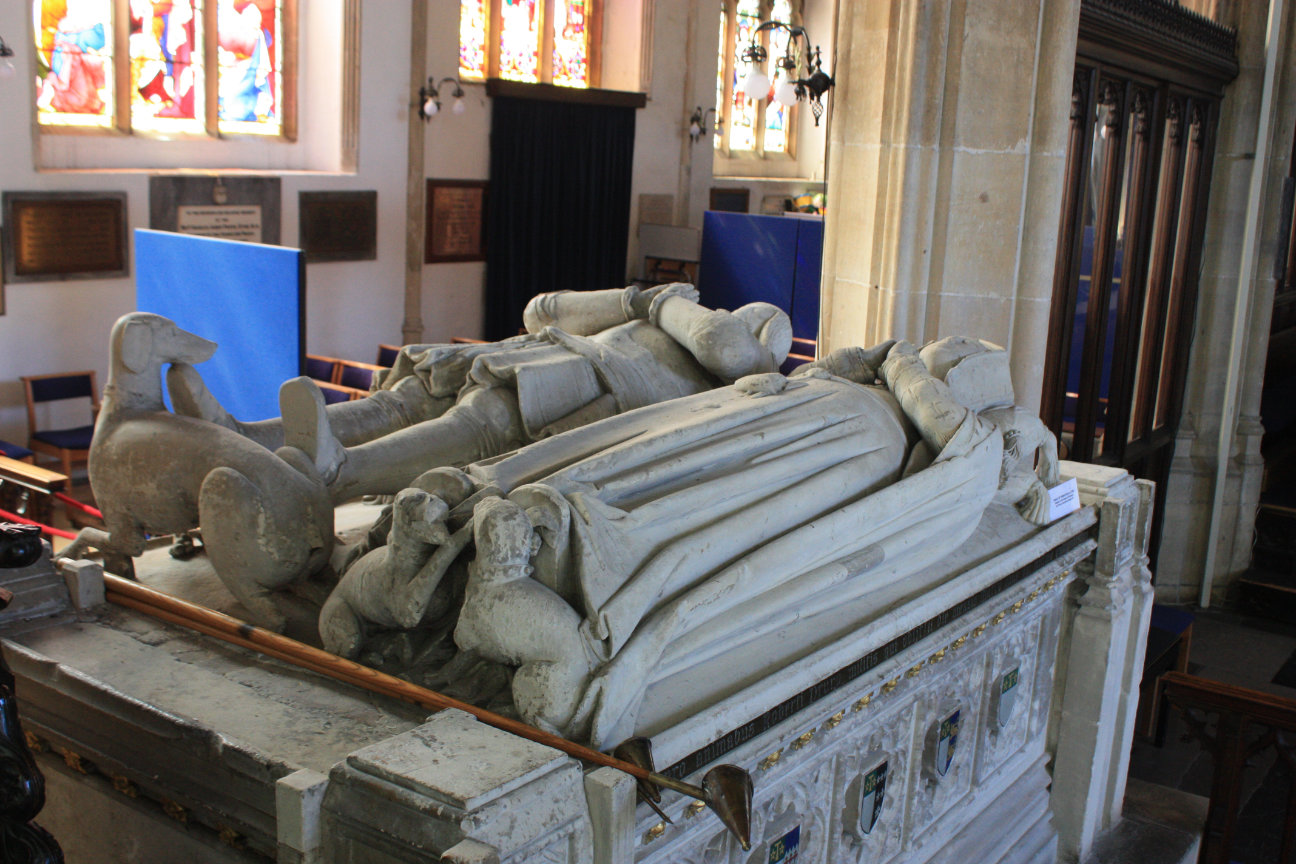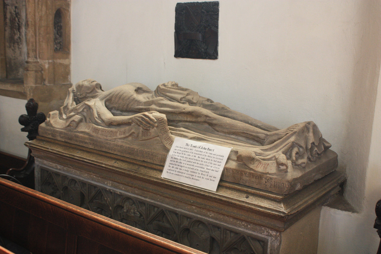 The cadaver tomb of John Baret showing him as a corpse, drawn and withered. Baret died in 1467, leaving a wonderfully detailed will. A wealthy and well connected cloth merchant, he lived in Chequer Square. John Baret's marriage was childless and evidently unhappy. By the time he wrote his will in 1463, he and his wife would seem to have lived apart; Elizabeth receives just a single mention of one sentence, 11 pages into the 30 page document, in which he bequeathes her only a ring.