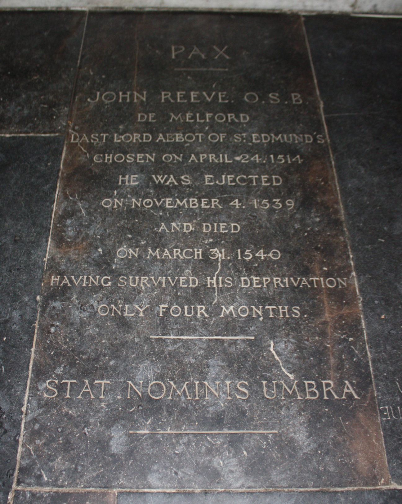 Prior to the Dissolution of the Monasteries the Abbot of the Abbey of St Edmund upheld the King's law and imposed, and collected, taxes in the whole of the area later to become West Suffolk. The Abbot also sat as a peer in Parliament. The last abbot, John Reeve, was given a pension, and may have lived his remaining days in this house in Crown Street. He died within a few months of the surrender of the abbey, and may never have received his generous pension of £333.