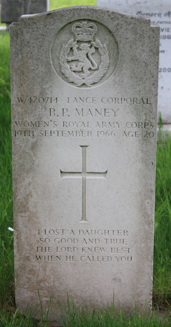 Lance Corporal B. P. Maney served in the Women's Royal Army Corps. She died aged 20.