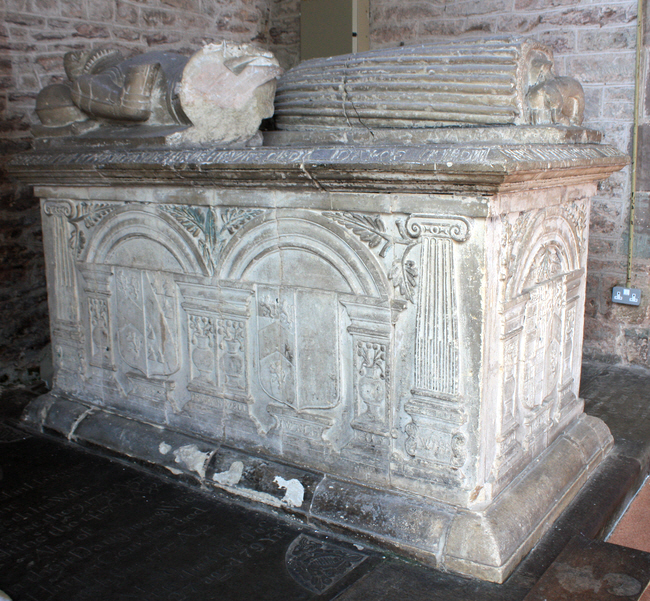 The chest tomb for Richard and Anne Willison by John Gildo, possibly an Italian, of Hereford, of 1574. The effigies have been badly mutilated.