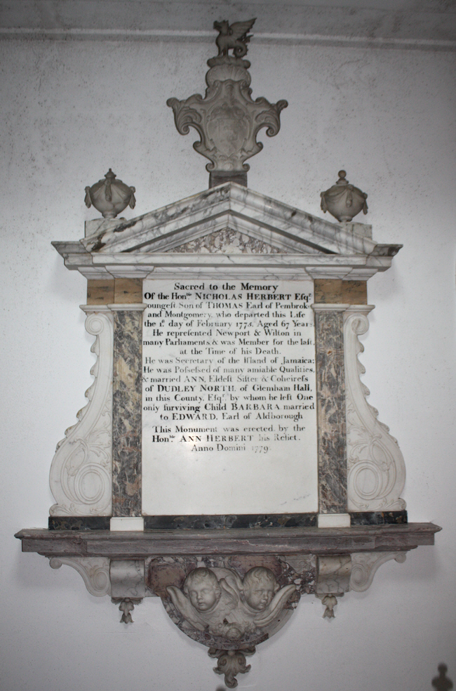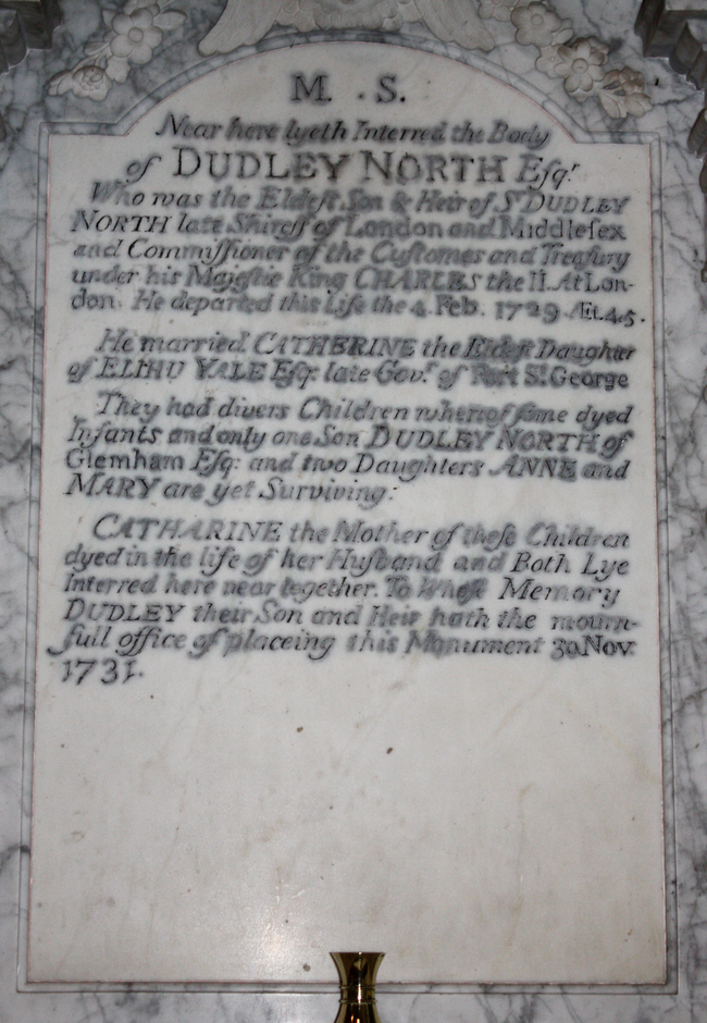 In grim isolation sits Sir Dudley North MP, who died in 1829. It was once described on BBC Radio Suffolk as the ugliest memorial to be found in any Suffolk church.