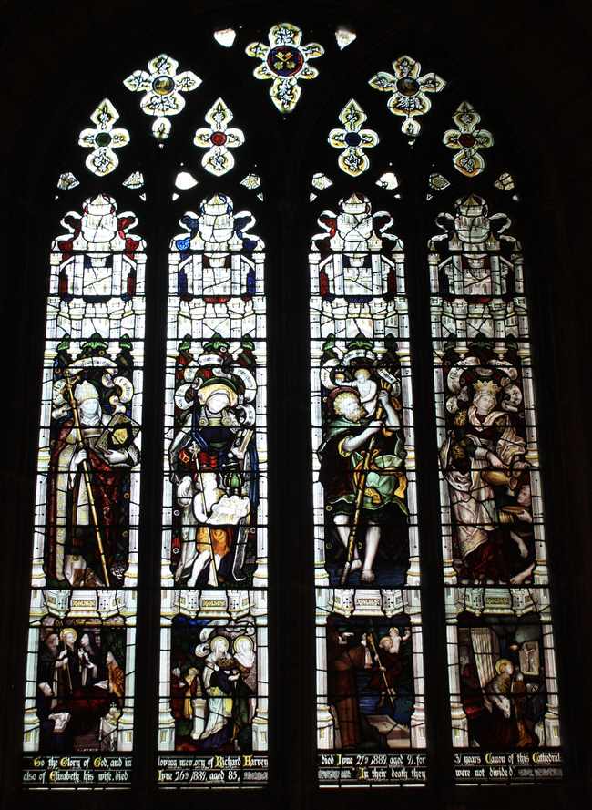 When the east window was installed in about 1350 it was the largest window in Europe. The arms of noble families are at the bottom; above them are abbotts, bishops, saints and martyrs.