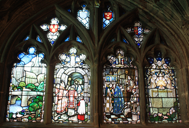 A stained glass window by Kempe. Each of the six lights has several different saints.
