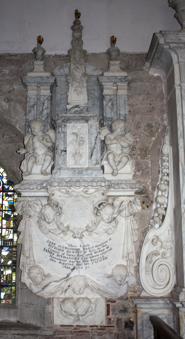 On the north wall of the chancel is the white marble monument in Baroque style to James Scudamore who died in 1668. It contains a sculpture representing James Scudamore in a sitting position, wearing Roman dress. Above his head are two cherubs, and the whole is framed between two pilasters.