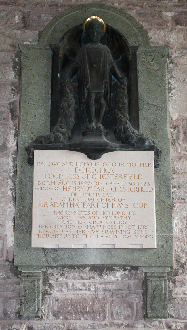On the east wall of the south chapel is a monument to Mary Scudamore Stanhope who died in 1859. This was sculpted by Matthew Noble in white marble, and depicts a female figure standing in a niche.