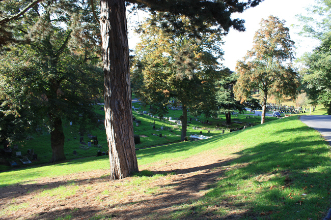 The cemetery has been built along the floor and up the sides of a valley near the centre of the town.
