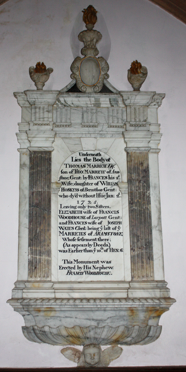In the Aramstone chapel there is a memorial to Thomas Marrett, who died in 1725. In consists of marble fluted Doric pilasters flanking the inscription panel with Doric entablature surmounted by cartouche.