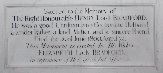 A double memorial to the Countess of Bradford and her teenaged daughter. The Countess died in 1842 having caught an infection from her daughter who died the next year.