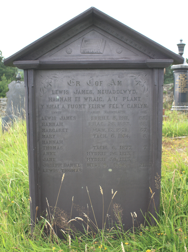This memorial records the names of the 8 children of Lewis and Hannah James and the dates of death of 6 of them. The word "Babanod" beside the names Anne and Jane is Welsh for babies.