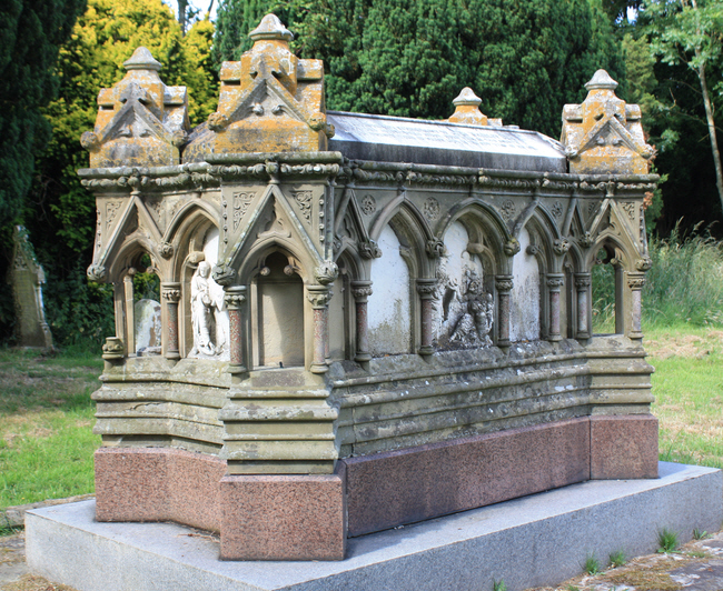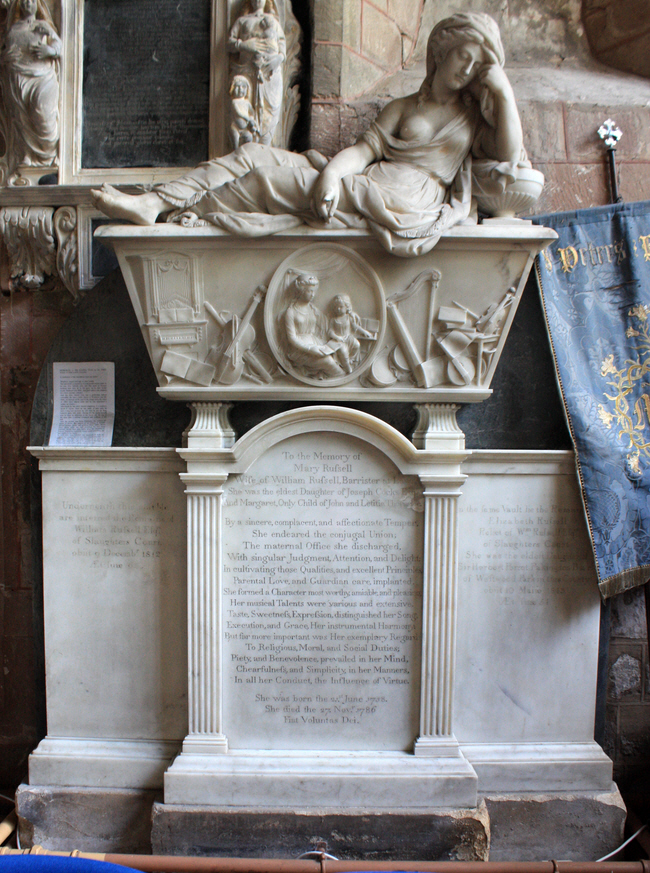 The memorial to Mary Russell (1758 - 1786) by Thomas Scheemakers consisting of a semi-reclining female figure and a sarcophagus carved with mother and child and musical instruments.