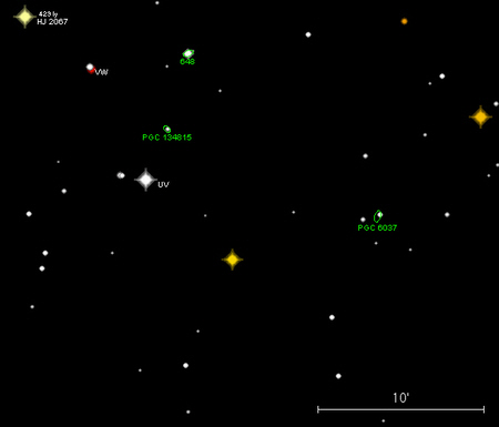 Luyten 726-8 AB or UV CETI is the sixth closest system to Sol located only about 8.7 light-years away in the southwestern part (01 39 01.3 -17 57 01) of Cetus, the Whale. UV Ceti is an extreme example of a flare star - that is one that can boost its brightness by a factor of five in less than a minute!