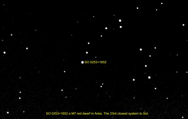 SO 0253-1652 is the 23rd closest system to Sol and is located in Aries, the Ram. SO 0253-1652 was first reported as recently as 2006 and consists of a red dwarf of spectral class M7.0 and with an estimated mass of only 8% that of the Sun.