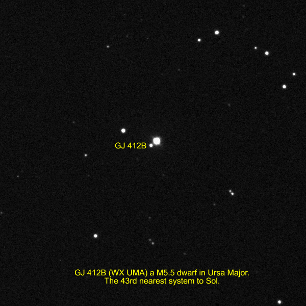 WX UMA is the 43rd closest system to Sol. The twin system consists of a red dwarf of spectral class M1.0 and another with a spectral class of M5.5 and with an estimated mass of only 10% that of the Sun.