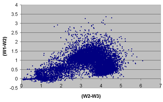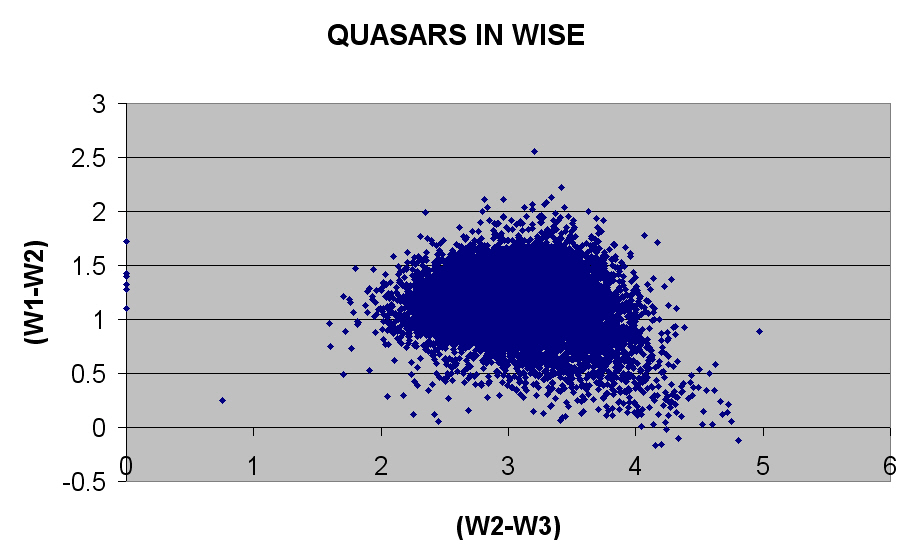 A large sample of SDSS quasars were extracted from the 2010 catalogue compiled by Veron. The astrometric data was then used as an input file for the WISE database. As can be seen the colour-colour diagram for the quasars is very different from that for a random selection of entries in the WISE database.
