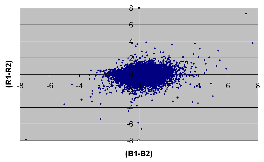 When 32000 of these results are plotted graphically- 32000 is the upper limit in Microsoft Excel - it can be seen how rare it is for the two blue or the two red results to be more than four magnitudes apart.