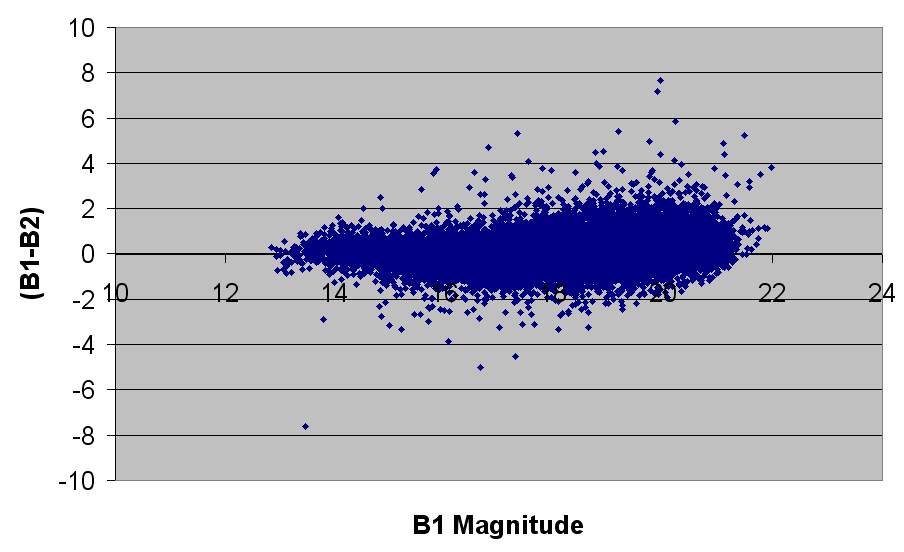 As can be seen there is a clear tendancy for the (B1-B2) value to show more scatter as progressively fainter objects are studied.