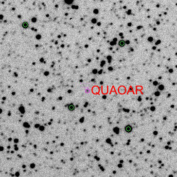 Imaged on April 5th 2009 using the 0.61m f/10 Cassegrain at the Sierra Stars Observatory. 120 seconds unfiltered image, cut down to 5 x 5 arc minutes. Quaoar was at magnitude 19.1.