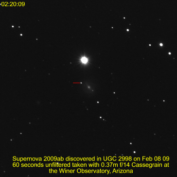 Discovered 2009/02/08.24 by Lick Observatory Supernova Search. Found in UGC 2998 at R.A. = 04h16m36s.39, Decl. = +02°45'51".0