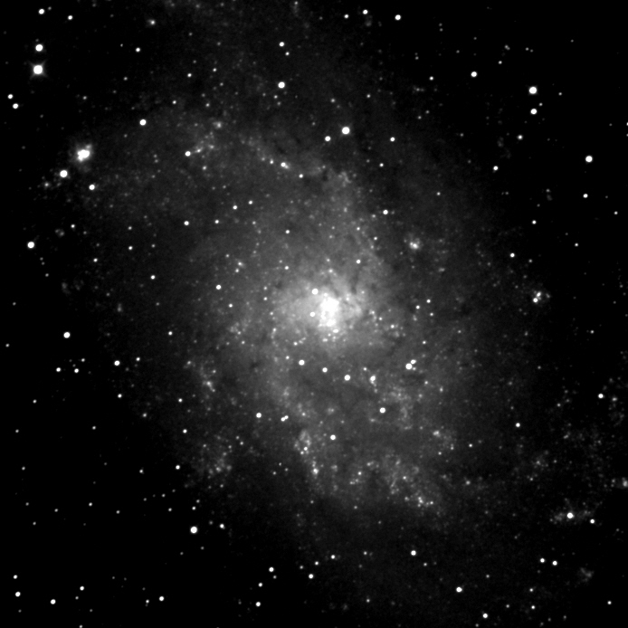 M33 is a magnificent face-on spiral galaxy with a diameter of 50,000 light-years and a mass of 25 billion solar masses. About 3 million light-years away a number of star clusters and star forming regions can be seen along the galaxy's loosely wound spiral arms. A feature of M33 is the lack of a bright core and low overall surface brightness. With a brighter core M33 would be an easy naked eye object.