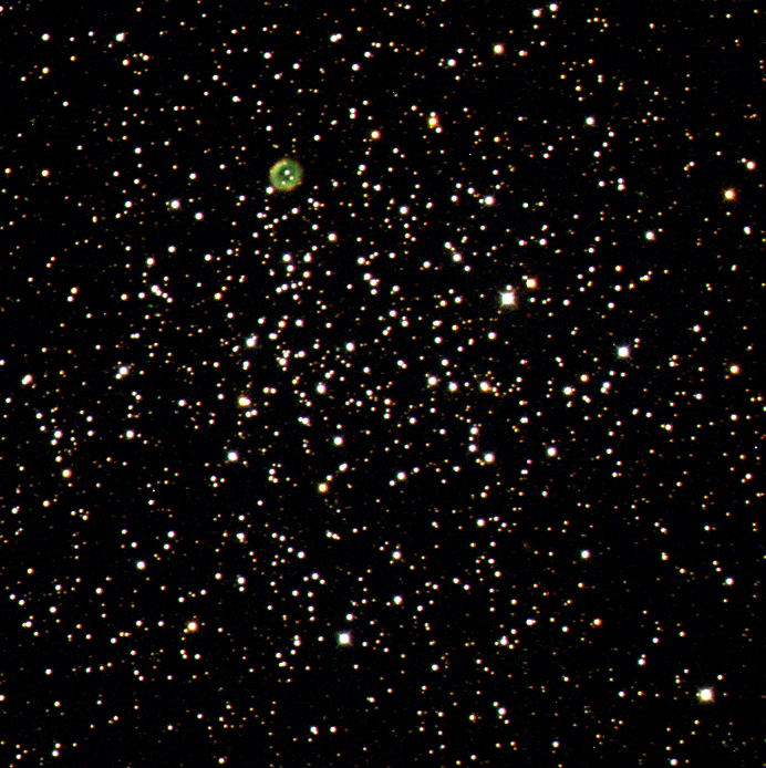 The open cluster M46 (NGC 2437) lies at a distance of about 5400 light years. It has a diameter of 30 light years and an estimated age of about 300 million years.