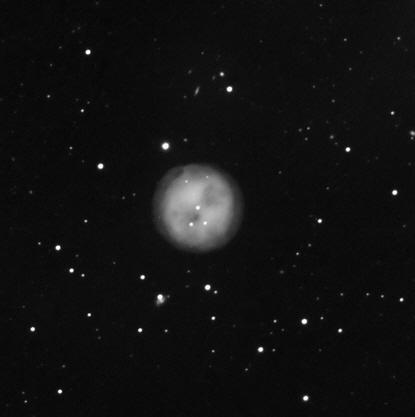 The Owl Nebula (M97, NGC 3587) is one of four planetary nebulae in the Messier catalogue. The mass of the nebula is about 0.15 solar masses and the age is about 6,000 years.